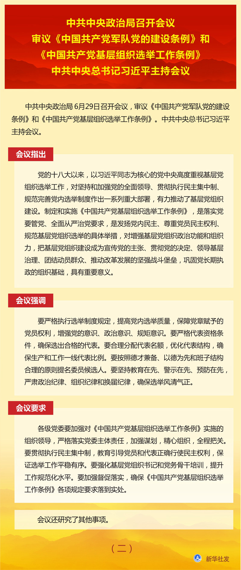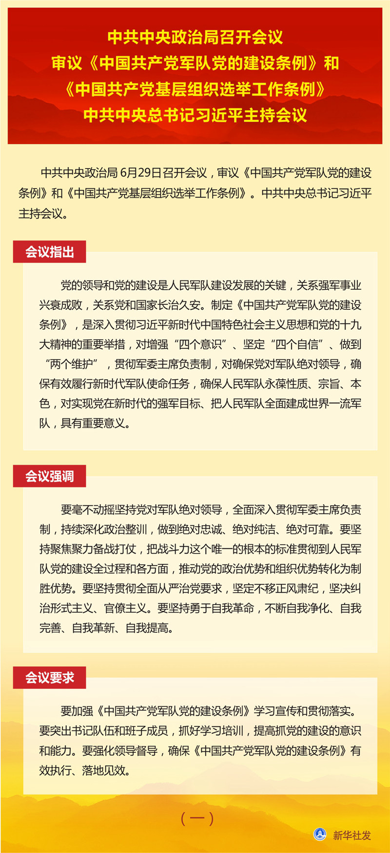 中共中央政治局召開會議 審議《中國共產(chǎn)黨軍隊(duì)黨的建設(shè)條例》和《中國共產(chǎn)黨基層組織選舉工作條例》 中共中央總書記習(xí)近平主持會議 新華社北京6月29日電 中共中央政治局6月29日召開會議,審議《中國共產(chǎn)黨軍隊(duì)黨的建設(shè)條例》和《中國共產(chǎn)黨基層組織選舉工作條例》。中共中央總書記習(xí)近平主持會議。 會議指出,黨的領(lǐng)導(dǎo)和黨的建設(shè)是人民軍隊(duì)建設(shè)發(fā)展的關(guān)鍵,關(guān)系強(qiáng)軍事業(yè)興衰成敗,關(guān)系黨和國家長治久安。制定《中國共產(chǎn)黨軍隊(duì)黨的建設(shè)條例》,是深入貫徹習(xí)近平新時代中國特色社會主義思想和黨的十九大精神的重要舉措,對增強(qiáng)“四個意識”、堅定“四個自信”、做到“兩個維護(hù)”,貫徹軍委主席負(fù)責(zé)制,對確保黨對軍隊(duì)絕對領(lǐng)導(dǎo),確保有效履行新時代軍隊(duì)使命任務(wù),確保人民軍隊(duì)永葆性質(zhì)、宗旨、本色,對實(shí)現(xiàn)黨在新時代的強(qiáng)軍目標(biāo)、把人民軍隊(duì)全面建成世界一流軍隊(duì),具有重要意義。 會議強(qiáng)調(diào),要毫不動搖堅持黨對軍隊(duì)絕對領(lǐng)導(dǎo),全面深入貫徹軍委主席負(fù)責(zé)制,持續(xù)深化政治整訓(xùn),做到絕對忠誠、絕對純潔、絕對可靠。要堅持聚焦聚力備戰(zhàn)打仗,把戰(zhàn)斗力這個唯一的根本的標(biāo)準(zhǔn)貫徹到人民軍隊(duì)黨的建設(shè)全過程和各方面,推動黨的政治優(yōu)勢和組織優(yōu)勢轉(zhuǎn)化為制勝優(yōu)勢。要堅持貫徹全面從嚴(yán)治黨要求,堅定不移正風(fēng)肅紀(jì),堅決糾治形式主義、官僚主義。要堅持勇于自我革命,不斷自我凈化、自我完善、自我革新、自我提高。 會議要求,要加強(qiáng)《中國共產(chǎn)黨軍隊(duì)黨的建設(shè)條例》學(xué)習(xí)宣傳和貫徹落實(shí)。要突出書記隊(duì)伍和班子成員,抓好學(xué)習(xí)培訓(xùn),提高抓黨的建設(shè)的意識和能力。要強(qiáng)化領(lǐng)導(dǎo)督導(dǎo),確?!吨袊伯a(chǎn)黨軍隊(duì)黨的建設(shè)條例》有效執(zhí)行、落地見效。 會議指出,黨的十八大以來,以習(xí)近平同志為核心的黨中央高度重視基層黨組織選舉工作,對堅持和加強(qiáng)黨的全面領(lǐng)導(dǎo)、貫徹執(zhí)行民主集中制、規(guī)范完善黨內(nèi)選舉制度作出一系列重大部署,有力推動了基層黨組織建設(shè)。制定和實(shí)施《中國共產(chǎn)黨基層組織選舉工作條例》,是落實(shí)黨要管黨、全面從嚴(yán)治黨要求,是發(fā)揚(yáng)黨內(nèi)民主、尊重黨員民主權(quán)利、規(guī)范基層黨組織選舉的具體舉措,對增強(qiáng)基層黨組織政治功能和組織力,把基層黨組織建設(shè)成為宣傳黨的主張、貫徹黨的決定、領(lǐng)導(dǎo)基層治理、團(tuán)結(jié)動員群眾、推動改革發(fā)展的堅強(qiáng)戰(zhàn)斗堡壘,鞏固黨長期執(zhí)政的組織基礎(chǔ),具有重要意義。 會議強(qiáng)調(diào),要嚴(yán)格執(zhí)行選舉制度規(guī)定,提高黨內(nèi)選舉質(zhì)量,保障黨章賦予的黨員權(quán)利,增強(qiáng)黨的意識、政治意識、規(guī)矩意識。要嚴(yán)格代表資格條件,確保選出合格的代表。要合理分配代表名額,優(yōu)化代表結(jié)構(gòu),確保生產(chǎn)和工作一線代表比例。要按照德才兼?zhèn)?、以德為先和班子結(jié)構(gòu)合理的原則提名委員候選人。要堅持教育在先、警示在先、預(yù)防在先,嚴(yán)肅政治紀(jì)律、組織紀(jì)律和換屆紀(jì)律,確保選舉風(fēng)清氣正。 會議要求,各級黨委要加強(qiáng)對《中國共產(chǎn)黨基層組織選舉工作條例》實(shí)施的組織領(lǐng)導(dǎo),嚴(yán)格落實(shí)黨委主體責(zé)任,加強(qiáng)謀劃,精心組織,全程把關(guān)。要貫徹執(zhí)行民主集中制,教育引導(dǎo)黨員和代表正確行使民主權(quán)利,保證選舉工作平穩(wěn)有序。要強(qiáng)化基層黨組織書記和黨務(wù)骨干培訓(xùn),提升工作規(guī)范化水平。要加強(qiáng)督促落實(shí),確?!吨袊伯a(chǎn)黨基層組織選舉工作條例》各項(xiàng)規(guī)定要求落到實(shí)處。 會議還研究了其他事項(xiàng)。 |
