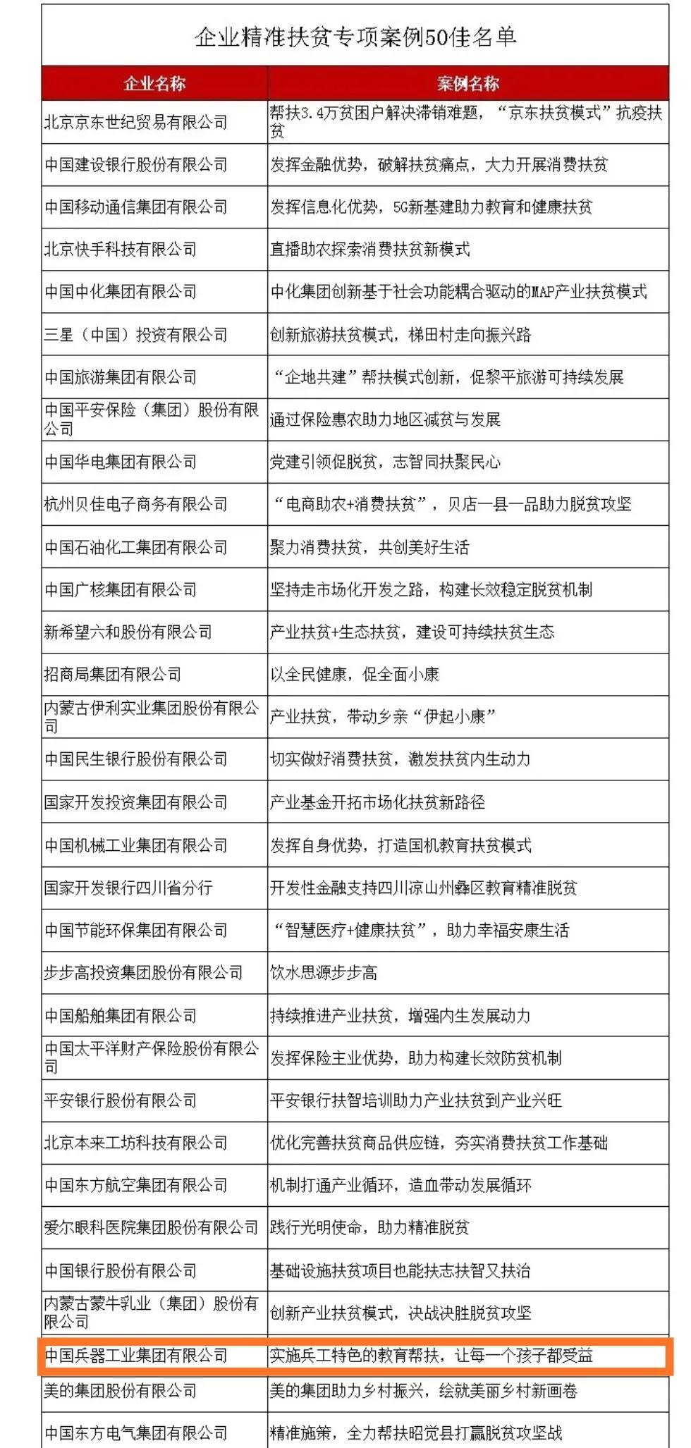 兵器工業(yè)集團(tuán)教育扶貧獲評(píng)國務(wù)院扶貧辦2020年企業(yè)精準(zhǔn)扶貧專項(xiàng)案例“50佳” |