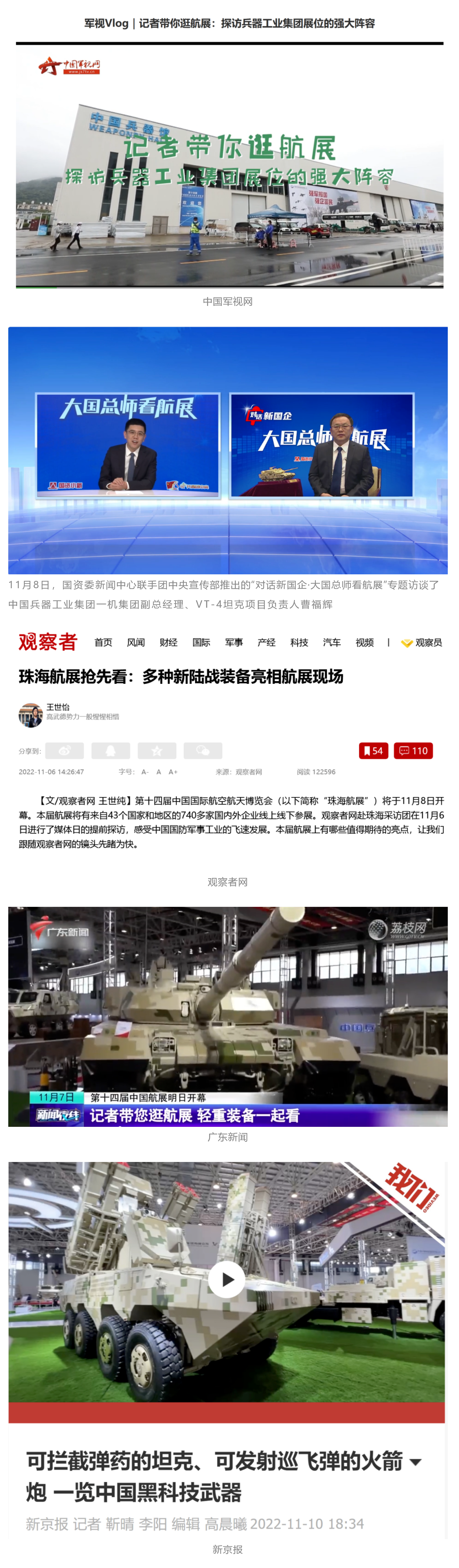 央視國防軍事頻道航展特別報道《炫舞天地間》11月12日《賞“鐵甲雄風(fēng)”!看航展地面裝備“鋼鐵洪流”名場面》對兵器工業(yè)集團(tuán)武器裝備特色亮點進(jìn)行報道?!秶儡娛略鐖蟆?1月7日推出報道《第十四屆中國國際航空航天博覽會明天開幕 中國兵器館首次以陸軍合成旅實戰(zhàn)體系形式展出》,對兵器館陸軍合成旅實戰(zhàn)體系進(jìn)行報道?!盾娛聢蟮馈?1月9日推出《第十四屆中國國際航空航天博覽會 地面兵器裝備首次聯(lián)合陸航直升機(jī)進(jìn)行動態(tài)展示》報道?!盾娒孕刑煜隆?1月9日推出報道《軍迷打卡航展2022》以專業(yè)軍迷視角探館兵器館,全面展示兵器工業(yè)集團(tuán)參展裝備特色亮點。