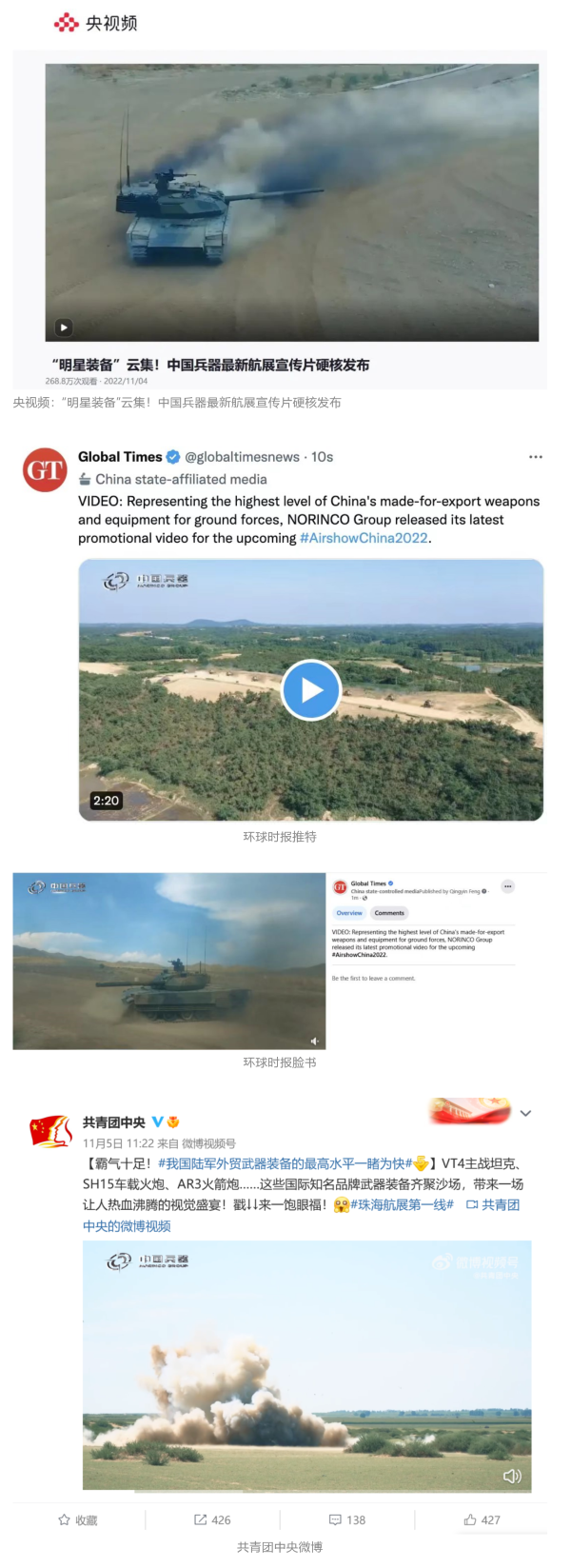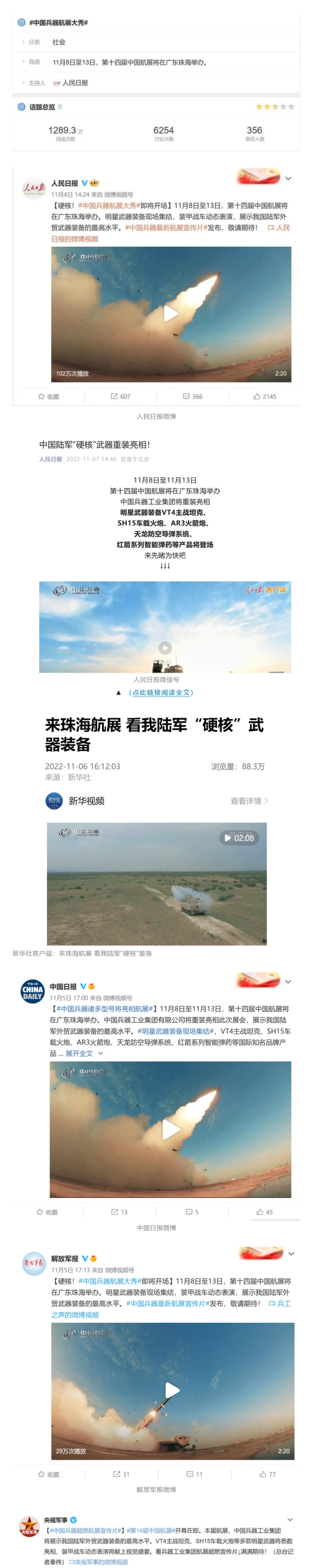 人民日報官方微博、微信公眾號,新華社客戶端、央視新聞客戶端、中國日報微博、參考消息微信公眾號、解放軍報微博、央視軍事微博、CGTN微博、中國軍號微博、共青團(tuán)中央微博、環(huán)球時報(英文網(wǎng)站、臉書賬號、推特賬號)、嗶哩嗶哩、學(xué)習(xí)強(qiáng)國平臺、國資小新視頻號、網(wǎng)易軍事、騰訊軍事、鳳凰軍事、北京日報、東方衛(wèi)視看看新聞全媒體、北京電視臺等20余家中央主流媒體、國家部委、省市媒體的新媒體第一時間播發(fā)集團(tuán)公司航展宣傳片等視頻作品燃爆全網(wǎng),累計閱讀量突破1700萬人次。集團(tuán)公司微信公眾號、微博、抖音號、快手號、微信視頻號、知乎號等新媒體宣傳片播放閱讀量超過800萬人次,點贊超過30萬人次。集團(tuán)公司微信公眾號推出《硬核!中國兵器最新航展宣傳片發(fā)布》《中國兵器航展節(jié)目單,請選出心中明星裝備》《航展首日,中國兵器閃耀亮相!》等7篇報道,閱讀量超過25萬人次,集團(tuán)公司微信視頻號、抖音號、快手號等新媒體賬號發(fā)布“中國兵器航展大秀”系列視頻,觀看量超過330萬人次。