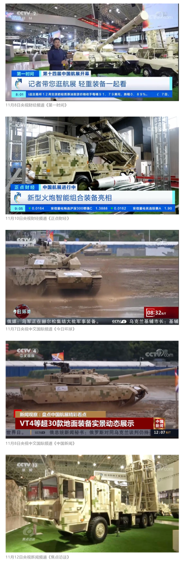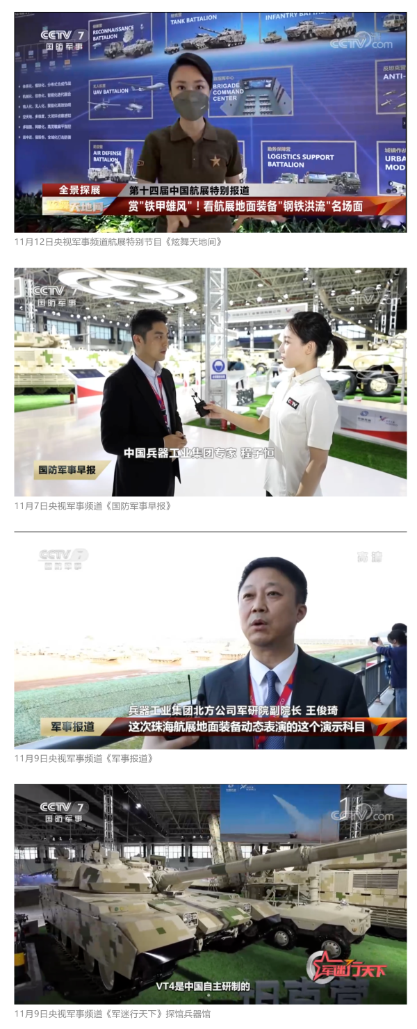 此次航展,央視新聞頻道《朝聞天下》《新聞直播間》《東方時空》《共同關(guān)注》《新聞30分》《24小時》、央視國防軍事頻道《國防軍事早報》《軍事報道》《軍迷行天下》、央視國際頻道《中國新聞》《今日環(huán)球》等欄目共播出兵器工業(yè)集團(tuán)參展相關(guān)新聞報道30余條。
