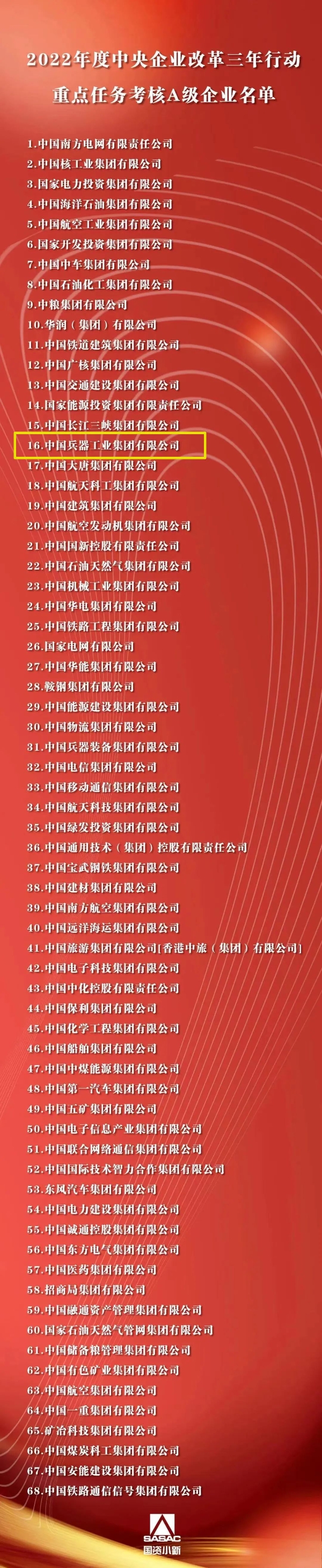 根據《中央企業(yè)改革三年行動重點任務考核實施方案(試行)》和《中央企業(yè)改革三年行動重點任務考核指標表(2022版)》,經審定,國務院國資委發(fā)布2022年度中央企業(yè)改革三年行動重點任務考核A級企業(yè)名單,中國兵器工業(yè)集團有限公司獲評A級。