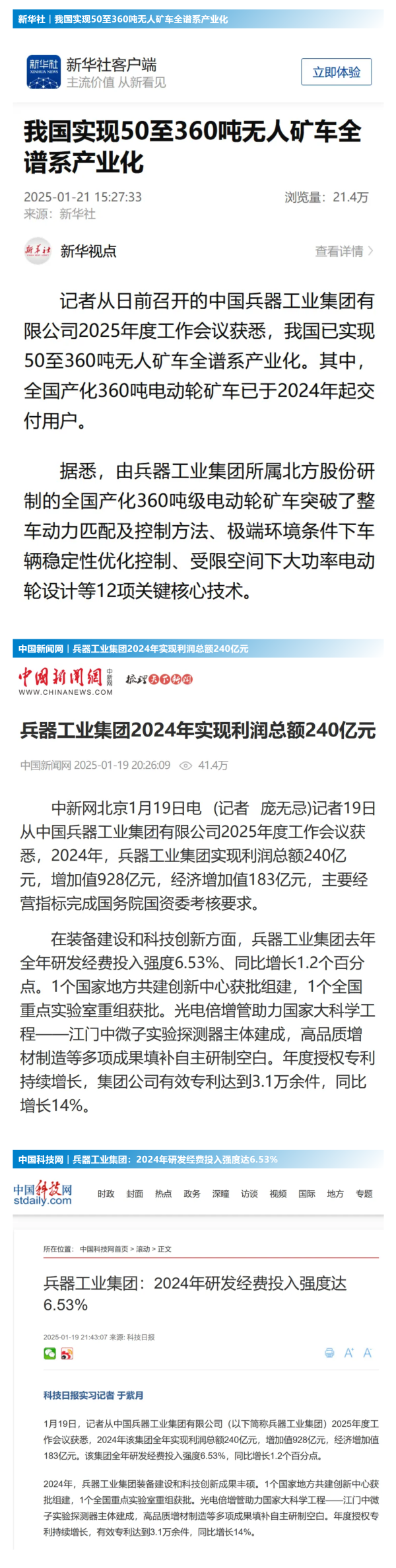 1月19日至20日,中國兵器工業(yè)集團(tuán)有限公司2025年度工作會(huì)議在京召開,會(huì)議總結(jié)2024年工作,分析形勢任務(wù),明確工作思路,部署2025年工作。 集團(tuán)公司2024年取得的成績及下一步重點(diǎn)工作受到社會(huì)媒體廣泛關(guān)注。新華社、中國新聞網(wǎng)、中國科技網(wǎng)、光明日報(bào)客戶端、經(jīng)濟(jì)日報(bào)客戶端、中國日報(bào)網(wǎng)、國務(wù)院國資委網(wǎng)站、學(xué)習(xí)強(qiáng)國中央企業(yè)學(xué)習(xí)平臺(tái)、新浪網(wǎng)、網(wǎng)易網(wǎng)、搜狐網(wǎng)、騰訊網(wǎng)、鳳凰網(wǎng)等中央主流媒體、國家部委網(wǎng)站及知名網(wǎng)絡(luò)媒體對集團(tuán)公司2025年度工作會(huì)議進(jìn)行了報(bào)道,重點(diǎn)關(guān)注集團(tuán)公司經(jīng)營業(yè)績、科技創(chuàng)新、產(chǎn)業(yè)結(jié)構(gòu)布局優(yōu)化等情況。其中,新華社以《我國實(shí)現(xiàn)50至360噸無人礦車全譜系產(chǎn)業(yè)化》為題,重點(diǎn)報(bào)道了集團(tuán)公司在推動(dòng)智能制造水平提升方面取得的成效;中國新聞網(wǎng)、光明日報(bào)客戶端、經(jīng)濟(jì)日報(bào)客戶端、中國日報(bào)網(wǎng)等就集團(tuán)公司2024年度經(jīng)營業(yè)績及各項(xiàng)工作取得的成果進(jìn)行報(bào)道;中國科技網(wǎng)著重報(bào)道了集團(tuán)公司在科技創(chuàng)新和優(yōu)化產(chǎn)業(yè)結(jié)構(gòu)布局方面的最新進(jìn)展。集團(tuán)公司門戶網(wǎng)站、微信公眾號、微博等新媒體平臺(tái)以及《中國兵工報(bào)》也對集團(tuán)公司工作會(huì)議進(jìn)行了及時(shí)報(bào)道,各成員單位紛紛對相關(guān)內(nèi)容進(jìn)行轉(zhuǎn)載,引發(fā)全系統(tǒng)關(guān)注。 集團(tuán)公司職工及廣大網(wǎng)友熱議工作會(huì) “2025年工作會(huì)為我們指明了發(fā)展方向、明確了奮斗目標(biāo),面對全新的機(jī)遇和挑戰(zhàn),作為兵工人深感責(zé)任重大?!?/p> “科技是第一生產(chǎn)力,一定要以科技創(chuàng)新引領(lǐng)新質(zhì)生產(chǎn)力發(fā)展,為高質(zhì)量發(fā)展提供支撐?!?/p> “把各項(xiàng)工作做深、做實(shí)、做細(xì),努力為集團(tuán)公司高質(zhì)量發(fā)展添磚加瓦。” “2024年中國兵器展示了大國重器,祝新的一年中再創(chuàng)輝煌!” |